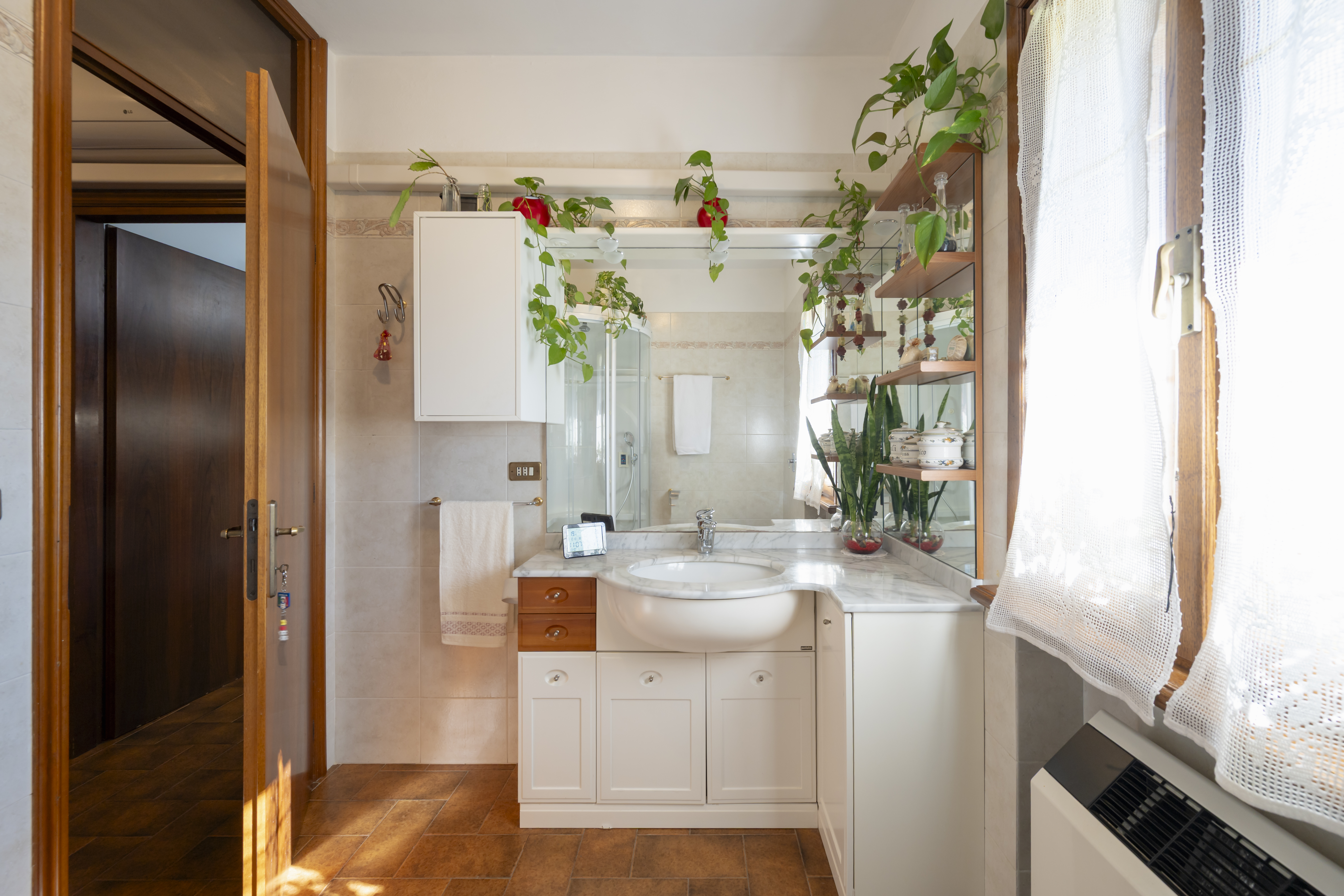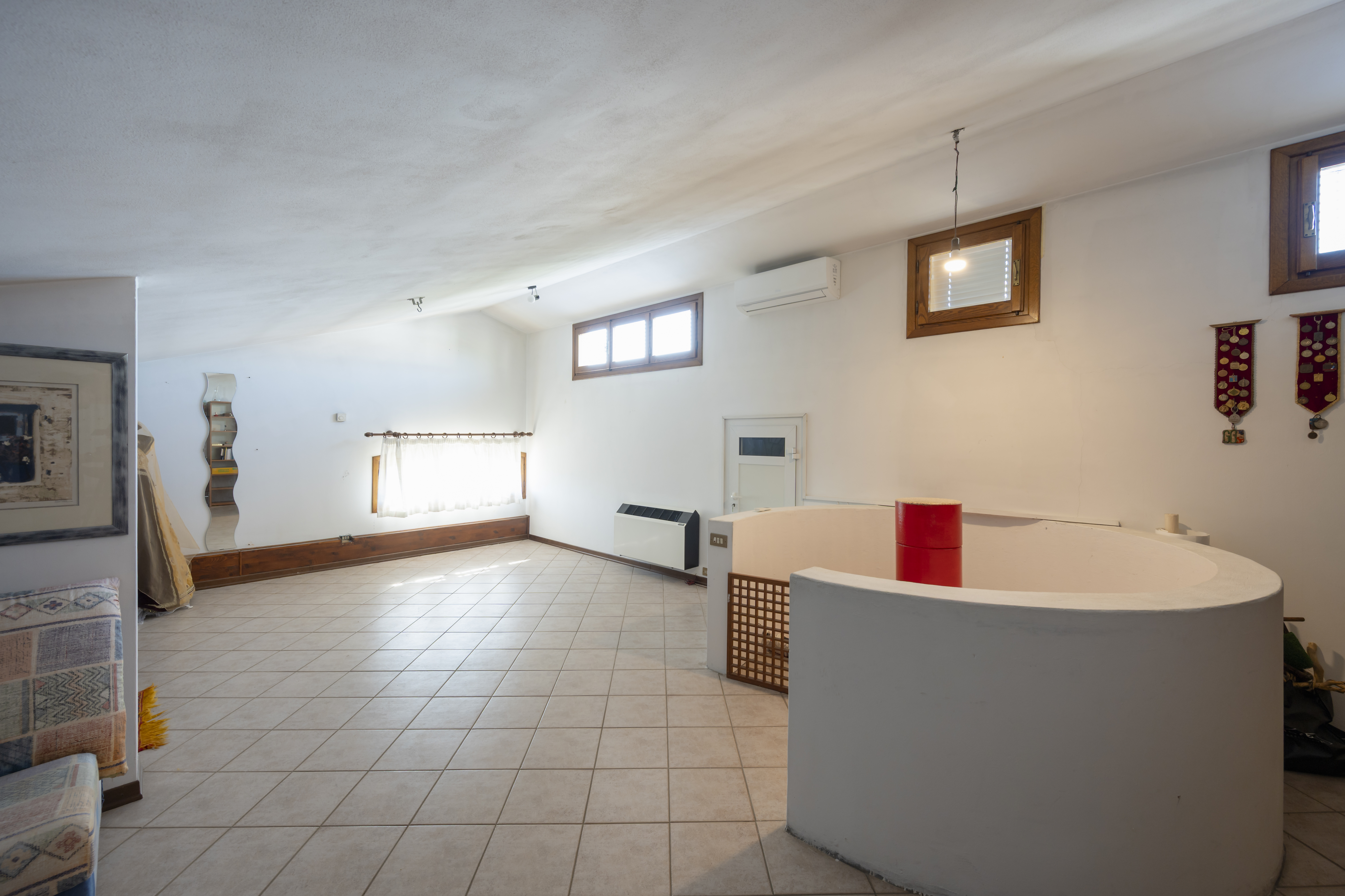 Salendo una scala a chiocciola si arriva a una mansarda di 60 mq, riscaldata e finestrata che può fungere da terza camera.